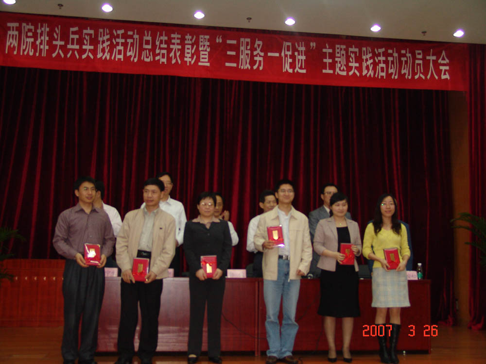 3月26日下午,中科院廣州分院、廣東省科學(xué)院召開了兩院排頭兵實(shí)踐活動(dòng)總結(jié)表彰大會(huì)。我院干細(xì)胞與再生醫(yī)學(xué)中心秦寶明、人事處徐瓊兩同志在本次活動(dòng)中被授予 “崗位排頭兵”的光榮稱號(hào),并在大會(huì)上受到表彰?!芭蓬^兵”活動(dòng)是繼保持共產(chǎn)黨員先進(jìn)性教育活動(dòng)后,中共廣東省直屬機(jī)關(guān)委員會(huì)組織開展的又一活動(dòng),旨在要求廣大黨員和省級(jí)機(jī)關(guān)的同志在各項(xiàng)工作中起到模范帶頭作用,當(dāng)好“排頭兵”。秦寶明、徐瓊兩名同志愛崗敬業(yè),團(tuán)結(jié)進(jìn)取,樂于奉獻(xiàn),以排頭兵的精神,分別在科研與管理崗位上為廣州醫(yī)藥院的籌建與發(fā)展做出了積極的貢獻(xiàn),經(jīng)過我院黨組織推薦獲得表彰。