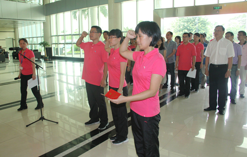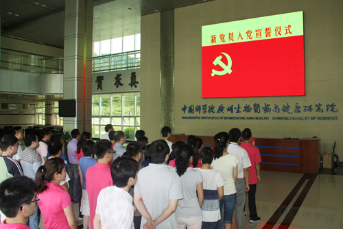 6月27日下午,中科院廣州生物醫(yī)藥與健康研究院藥物開發(fā)體系(DDP)黨支部在研究院大廳隆重舉行了新黨員入黨宣誓儀式。儀式由黨支部書記劉小蓉主持,院黨委書記黃建沖、黨支部全體黨員、全院入黨積極分子和其他團(tuán)隊(duì)黨支部黨員代表參加了儀式。