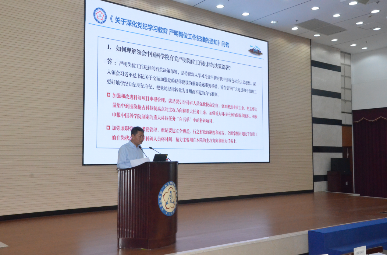 會(huì)上,張鴻翔詳細(xì)傳達(dá)并解讀了中國(guó)科學(xué)院《關(guān)于深化黨紀(jì)學(xué)習(xí)教育嚴(yán)明崗位工作紀(jì)律通知》和《關(guān)于推進(jìn)黨紀(jì)學(xué)習(xí)教育常態(tài)化長(zhǎng)效化的通知》的新精神和新要求,并對(duì)院里關(guān)于開(kāi)展“深化黨紀(jì)學(xué)習(xí)教育嚴(yán)明崗位工作紀(jì)律”專項(xiàng)工作的決策部署、具體要求和研究院的落實(shí)情況進(jìn)行了全面深入的介紹和闡述。