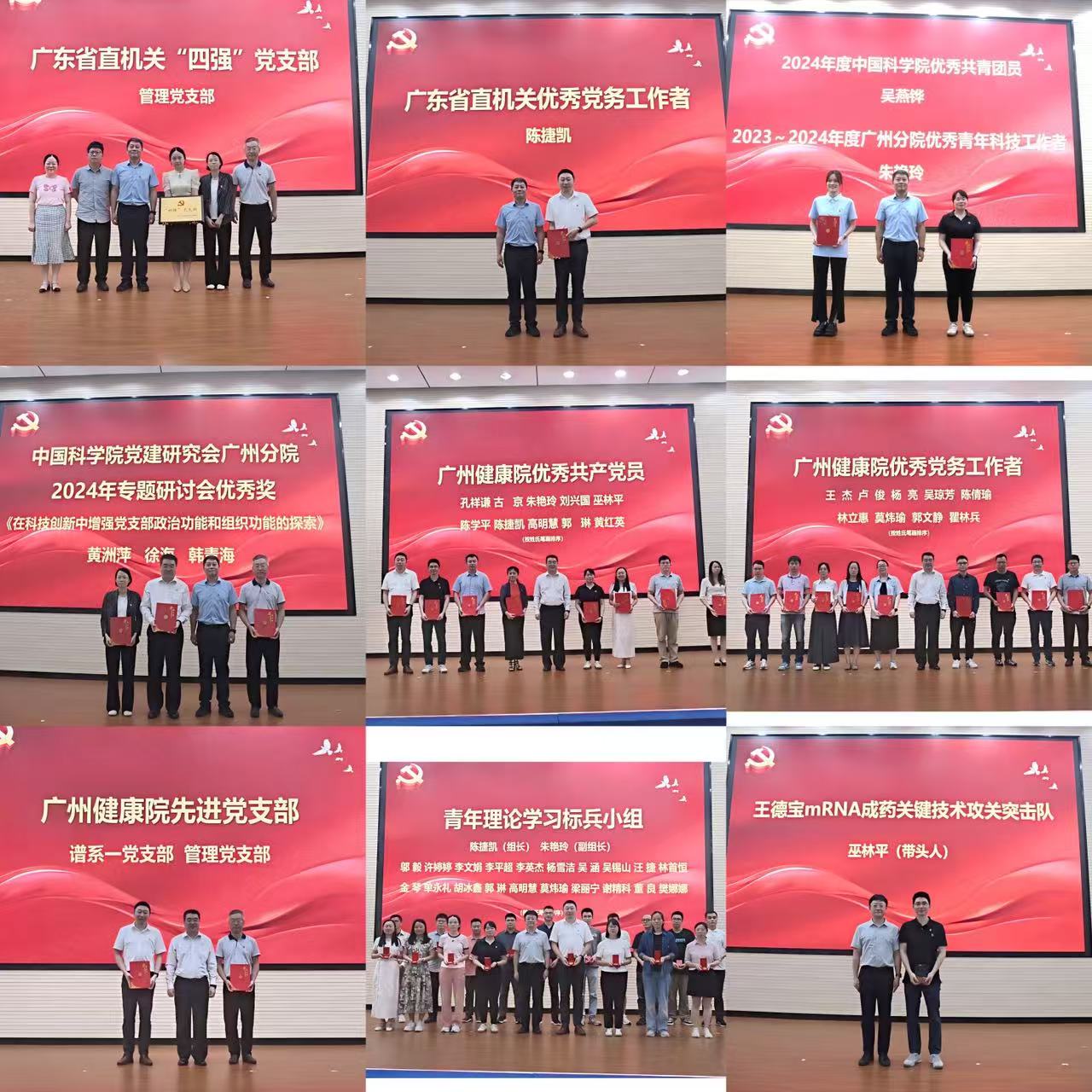 報告后,大會舉行新黨員入黨宣誓儀式,全體黨員重溫入黨誓詞。會議表彰了省直機關(guān)“四強”黨支部、優(yōu)秀黨務(wù)工作者、中國科學(xué)院優(yōu)秀共青團(tuán)員和廣州分院優(yōu)秀青年科技工作者、廣州健康院“兩優(yōu)一先”等先進(jìn)個人與集體,并為青年理論學(xué)習(xí)標(biāo)兵小組授章。為激勵科研尖兵勇闖“無人區(qū)”,會上為新成立的王德寶mRNA成藥關(guān)鍵技術(shù)攻關(guān)突擊隊授牌。
