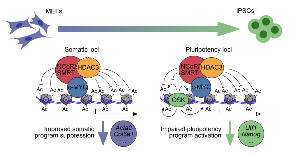 轉(zhuǎn)錄輔助抑制因子NCoR/SMRT復(fù)合物通過介導(dǎo)組蛋白去乙?;纬审w細(xì)胞重編程的關(guān)鍵障礙(2018,Nature Cell Biology)。