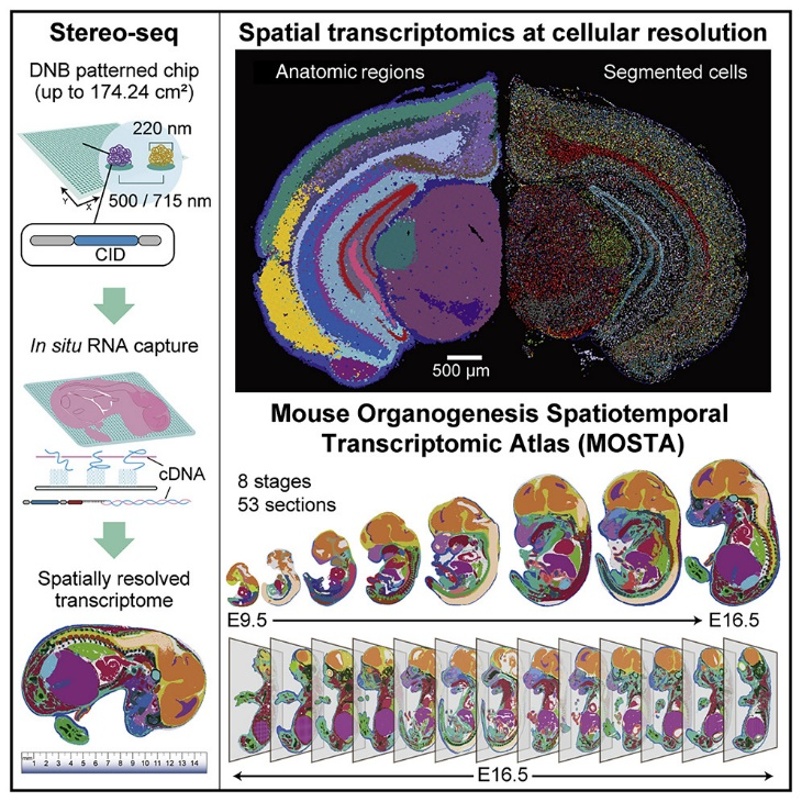 建立Stereo-seq技術(shù),揭示小鼠胚胎發(fā)育中晚期的器官發(fā)育基因的時(shí)空表達(dá)模式以及器官發(fā)育的軌跡。(2022, Cell)