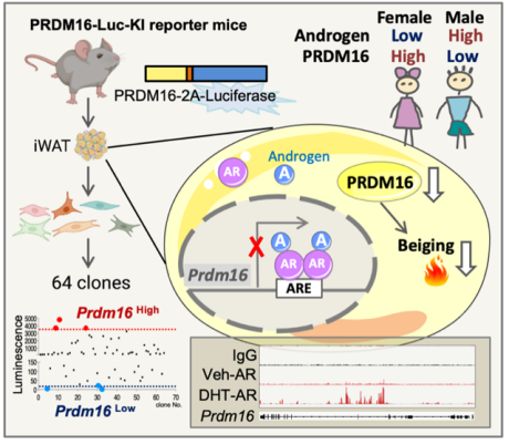 近年來研究發(fā)現(xiàn),成人體內(nèi)的白色脂肪組織在特定條件下可轉(zhuǎn)變成“米色脂肪”,后者可將機(jī)體多余能量以熱量形式消耗。因此,激活米色脂肪是目前對(duì)抗肥胖、代謝疾病的最新治療方式。PRDM16是白色脂肪細(xì)胞褐色化的關(guān)鍵轉(zhuǎn)錄因子,研究揭示了雄激素受體(Androgen Receptor,AR)通過直接抑制米色脂肪激活的關(guān)鍵分子PRDM16的表達(dá),負(fù)向調(diào)控米色脂肪細(xì)胞活性。研究同時(shí)發(fā)現(xiàn)女性具有更高的PRDM16表達(dá)水平,從臨床上證實(shí)了雄激素及其受體通路對(duì)PRDM16和米色脂肪的抑制作用。相關(guān)成果于2023年5月21日發(fā)表在Advanced Science上。