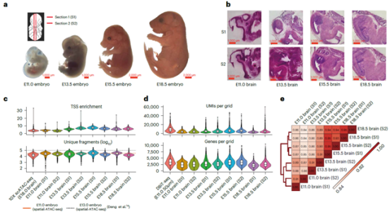 該研究揭示了一種名為MISAR-seq的空間多組學(xué)技術(shù)未配對(duì)的括號(hào)或引號(hào)(Microfluidic indexing-based spatial assay for ATAC and RNA-sequencing未配對(duì)的括號(hào)或引號(hào))。該技術(shù)通過微流控芯片依賴的靶向barcode遞送系統(tǒng),在保留細(xì)胞空間位置信息的前提下同時(shí)實(shí)現(xiàn)了細(xì)胞內(nèi)ATAC和RNA兩種組學(xué)信息的捕獲,并成功將其應(yīng)用在了胚胎期小鼠腦發(fā)育機(jī)制的研究中,不僅首次構(gòu)建出了小鼠腦發(fā)育的時(shí)空多組學(xué)圖譜,同時(shí)也揭示了啟動(dòng)子及增強(qiáng)子形成的順式調(diào)控元件在腦發(fā)育中的具體調(diào)控機(jī)制。相關(guān)成果發(fā)表在于2023年5月25日發(fā)表在Nature methods上。?