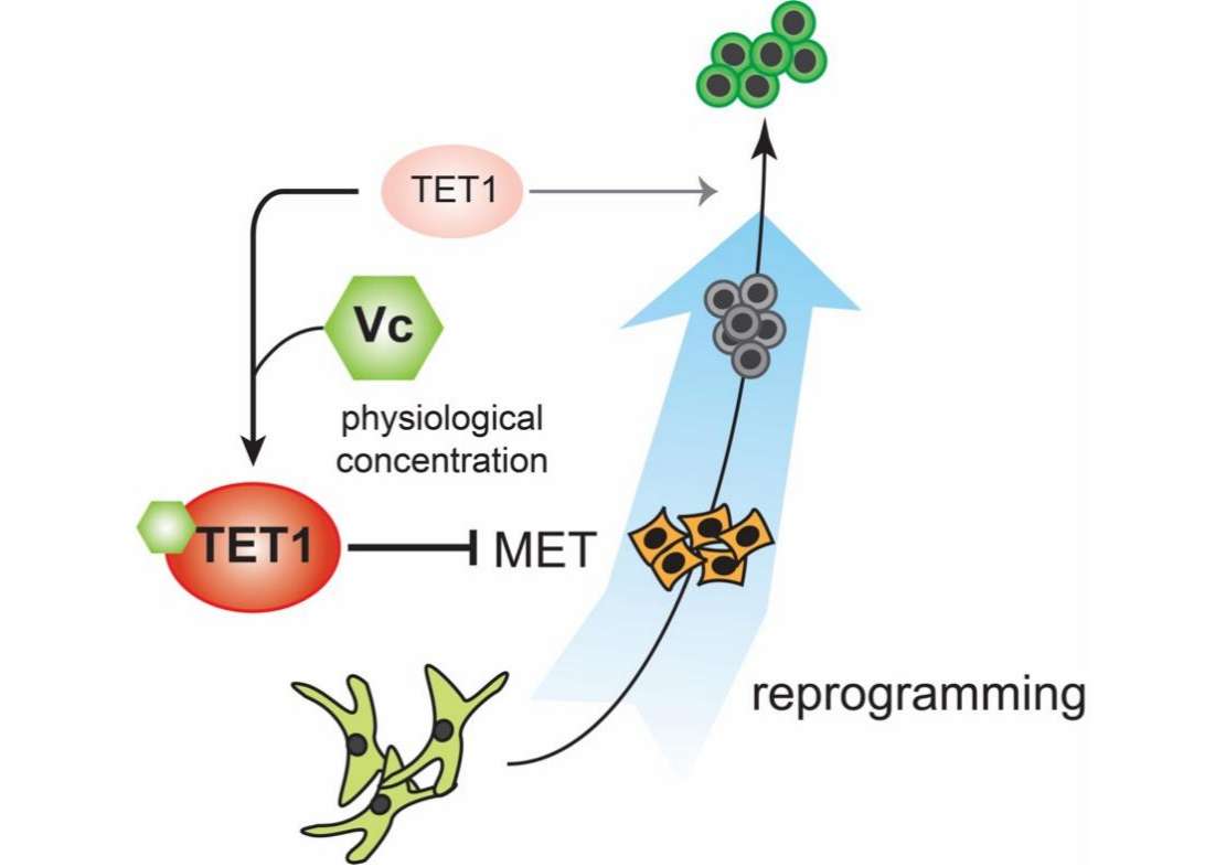 在體細胞重編程中發(fā)現(xiàn)DNA去甲基化相關酶TET1對重編程的作用在生理濃度VC存在情況下從促進轉為抑制。