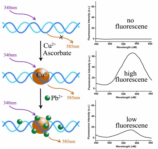 廣州生物院曾令文研究組采用隨機(jī)雙鏈DNA為模板,在銅離子和還原劑存在的情況下合成了穩(wěn)定的熒光銅納米顆粒,并成功構(gòu)建了生物傳感器用于痕量鉛離子的快速檢測。鉛離子能夠選擇地淬滅熒光銅納米顆粒的熒光,并且隨著鉛離子濃度的增加,熒光強(qiáng)度下降,從而達(dá)到檢測鉛離子的目的。