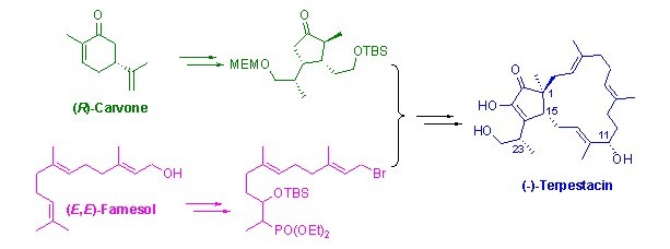 (?)-Terpestacin的主體結(jié)構(gòu)是五員環(huán)和十五員大環(huán)反式稠合(即[3,0,13]雙環(huán)骨架體系)而成的萜類化合物,大環(huán)上有三個反式三取代雙鍵。共有四個手性中心(即C1, C11, C15, C23), 其中C1 位是季碳手性中心。五員環(huán)為官能團密集的1,2-雙酮結(jié)構(gòu),其中一個羰基呈現(xiàn)烯醇式結(jié)構(gòu)。該分子的以上結(jié)構(gòu)特征,使得該分子進(jìn)行全合成具有較大的挑戰(zhàn)性。鑒于上述生物活性和結(jié)構(gòu)特點,該分子已成為許多世界著名大學(xué)(包括哈佛大學(xué)、斯坦福大學(xué)、麻省理工學(xué)院等)的著名學(xué)者的研究對象。目前文獻(xiàn)中已有六個研究組完成了該分子的合成(含四條不對稱合成路線),但合成步驟較長。
