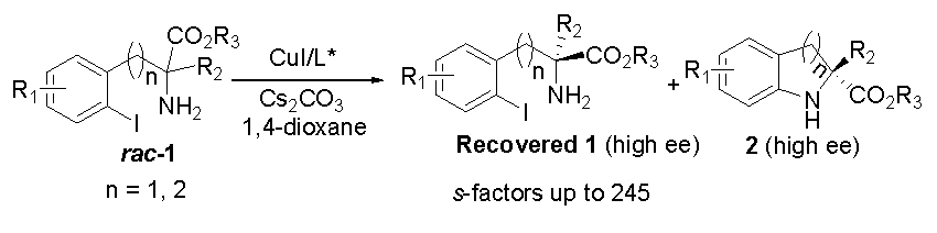 在CuI/(R)-BINOL衍生的配體作用下,消旋的2-氨基-3-(2-碘代芳基)丙酸酯以及2-氨基-4-(2-碘代芳基)-丁酸酯化合物的動(dòng)力學(xué)拆分反應(yīng)高光學(xué)選擇性的生成分子內(nèi)N-芳基化產(chǎn)物并回收光學(xué)富集的原料,反應(yīng)的選擇因子高達(dá)245。這一反應(yīng)為不對稱N-芳基化反應(yīng)提供了新的有效方法。
