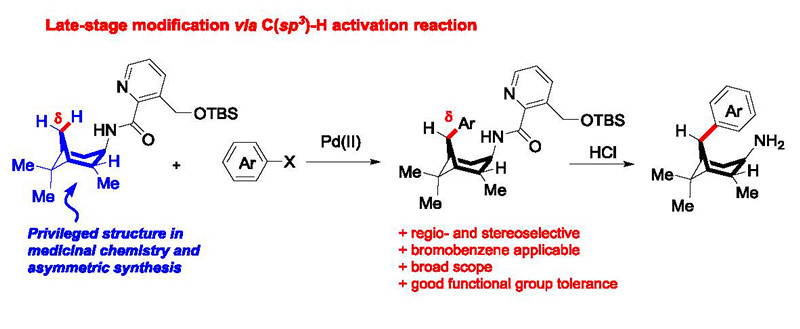 蒎烷胺是一類(lèi)具有良好抗流感活性、抗菌活性的天然胺類(lèi)小分子,其骨架在不對(duì)稱(chēng)合成中也有廣泛的應(yīng)用。由于其具有復(fù)雜的立體結(jié)構(gòu)及多個(gè)手性中心,對(duì)蒎烷胺的骨架修飾具有非常大的挑戰(zhàn)性,尤其是對(duì)其結(jié)構(gòu)中氨基δ位的橋環(huán)修飾成為難點(diǎn),并從未有報(bào)道。該團(tuán)隊(duì)通過(guò)在蒎烷胺的氨基上引入特殊定位基團(tuán),用二價(jià)鈀催化的C(sp3)?H活化反應(yīng)在蒎烷胺的氨基δ位引入了不同的芳香取代基,最后再脫去定位基團(tuán)得到δ位芳香取代的蒎烷胺。該反應(yīng)具有以下特點(diǎn):良好的立體及區(qū)域選擇性、廣泛的底物適用性及良好的官能團(tuán)耐受性。