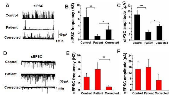 研究人員通過在iPS細胞水平上敲入紅色熒光蛋白基因來標記神經元網絡中的GABA能神經元亞型,首次在病人來源的神經元網絡中對表達Nav1.1的神經元亞型做了電生理檢測。同時,對網絡中自發(fā)抑制性及興奮性突觸后電活動進行了分析。研究發(fā)現(xiàn),突變c.a5768G(在外源性轉染體系中表現(xiàn)為無Nav1.1流)不僅影響表達Nav1.1的GABA能神經元上Nav總電流幅度的大小,而且影響Nav的通道激活性質。該變化進一步導致患者來源的神經元網絡中的自發(fā)性抑制性突觸后電流(sIPSCs)減弱。雖然自發(fā)的興奮性突觸后電流(sEPSCs)無顯著性變化,但是,當進一步分析sIPSCs和sEPSCs的頻率后,研究發(fā)現(xiàn),患者來源的神經元網絡突觸后活動從抑制為主的狀態(tài)轉化為興奮性為主的激發(fā)態(tài),這表明,僅僅sIPSCs的變化就足以顯著逆轉神經元網絡的興奮性水平?!?/p>