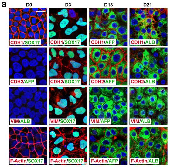 成熟肝臟細胞是典型的上皮細胞,可由其同屬上皮細胞的人胚胎干細胞通過體外定向分化而獲得。在上述研究中,科研人員發(fā)現這兩種上皮細胞之間的命運轉換需要經過一個間充質狀態(tài)的中間階段。在胚胎干細胞分化為定型內胚層階段發(fā)生了EMT過程,而隨后進一步的肝系分化成熟過程伴隨著MET過程。