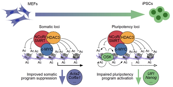 與此同時(shí),科研人員還發(fā)現(xiàn),重編程因子,尤其是c-MYC對(duì)這一抑制復(fù)合物在基因組上的結(jié)合起到了“導(dǎo)航”的功能,即帶領(lǐng)NCoR/SMRT結(jié)合到基因組靶位點(diǎn)上,從而發(fā)揮抑制功能。這一發(fā)現(xiàn)幫助解釋為什么包含c-MYC的重編程體系更容易產(chǎn)生不完全重編程的現(xiàn)象。