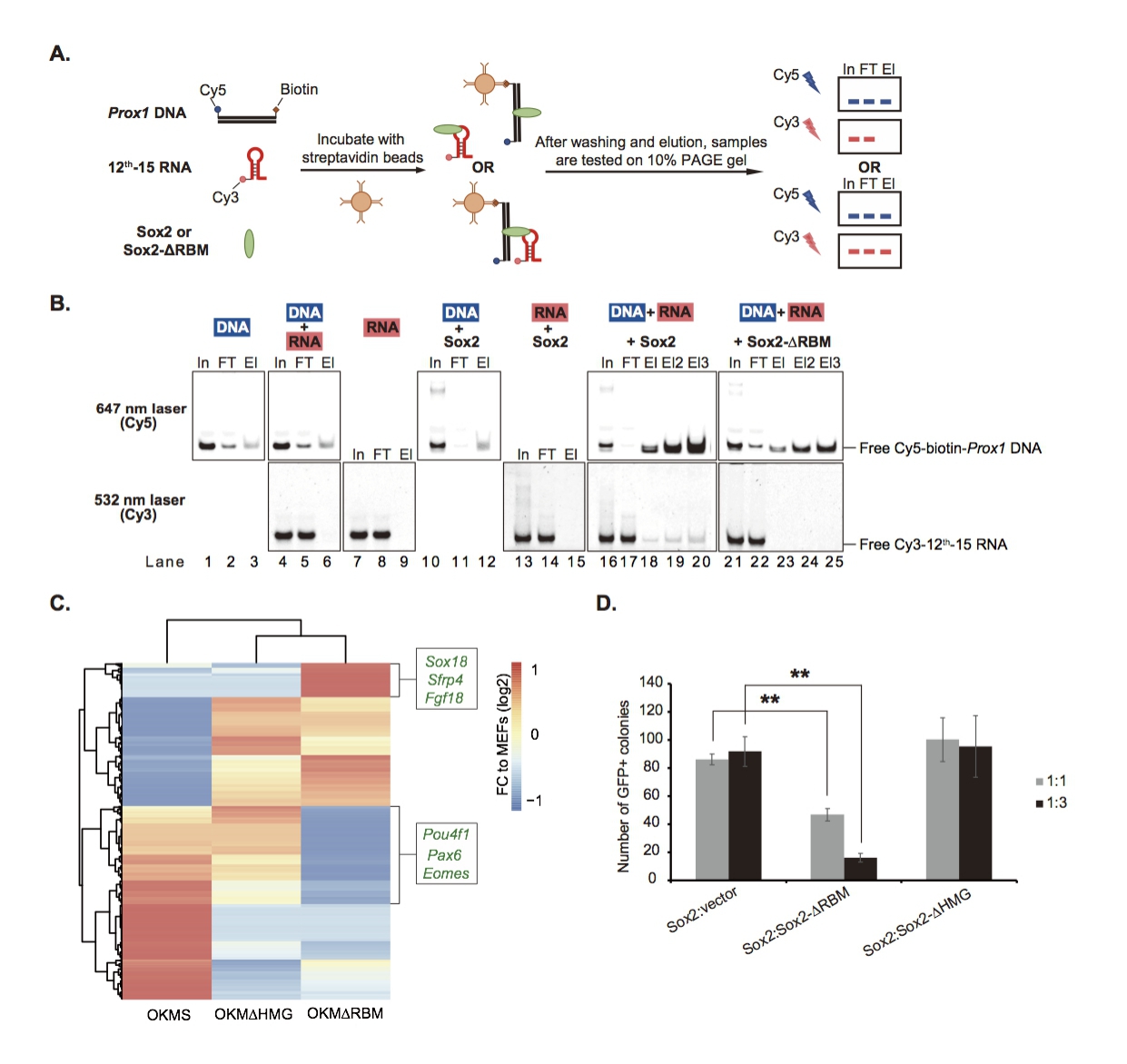 真核生物中,大約8%左右的核酸結(jié)合蛋白具有同時結(jié)合DNA和RNA的屬性(DNA- and RNA- binding proteins, 簡稱DRBPs)。這些DRBP廣泛參與mRNA加工、轉(zhuǎn)錄調(diào)控、DNA復(fù)制、DNA修復(fù)、應(yīng)激反應(yīng)和凋亡等生物學(xué)事件。Sox轉(zhuǎn)錄因子是胚胎發(fā)育和細(xì)胞重編程過程中確定細(xì)胞命運的重要調(diào)控因子,它在多能干細(xì)胞和神經(jīng)干細(xì)胞的更新和分化等過程中發(fā)揮了重要作用。此前一些證據(jù)表明,Sox2、hnRNP家族成員和長非編碼RNA(RMST)相互作用,調(diào)控神經(jīng)細(xì)胞分化,然而,Sox2是否直接與RNA結(jié)合? Sox2的哪些結(jié)構(gòu)域負(fù)責(zé)與RNA直接相互作用?在細(xì)胞重編程的過程中,DNA與RNA的結(jié)合功能如何相互協(xié)作? 都是需要深入研究的科學(xué)問題。