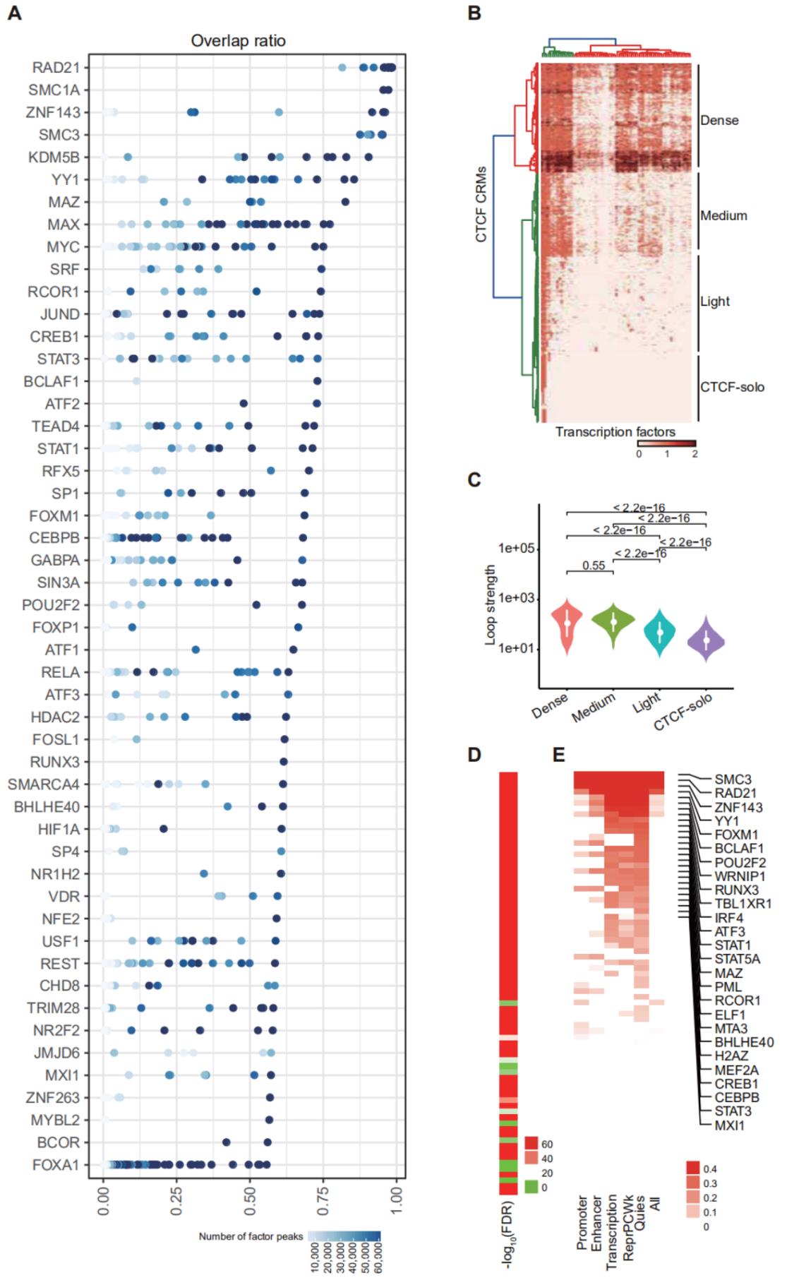 為了鑒定更多調(diào)控CTCF結(jié)合或CTCF介導(dǎo)的染色質(zhì)互作的轉(zhuǎn)錄因子,研究團隊從尋找CTCF共定位因子的角度出發(fā),整合數(shù)據(jù)庫中所有高質(zhì)量的轉(zhuǎn)錄因子ChIP-seq數(shù)據(jù),系統(tǒng)性地篩選在基因組上與CTCF具有共定位的轉(zhuǎn)錄因子。然而轉(zhuǎn)錄因子和CTCF的ChIP-seq數(shù)據(jù)要在同一細胞、同一處理的前提條件下才具有可比性,但具備這種條件的轉(zhuǎn)錄因子ChIP-seq數(shù)據(jù)非常少。該團隊利用CTCF在基因組上的結(jié)合具有保守性的特點,通過整合大量細胞和組織中CTCF ChIP-seq數(shù)據(jù),首次鑒定出人超保守的CTCF結(jié)合位點。這些結(jié)合位點在絕大多數(shù)細胞和組織中都存在,可以與所有轉(zhuǎn)錄因子的ChIP-seq數(shù)據(jù)進行比較,從而達到系統(tǒng)性篩選CTCF共定位因子的目的。通過這種方法,研究團隊鑒定出多種已經(jīng)報道的與CTCF具有高共定位率的蛋白因子如ZNF143、KDM5B以及Cohesin復(fù)合物中亞基 RAD21、SMC3和SMC1A等,說明了生物信息分析結(jié)果的可靠性。另外還鑒定出了多個之前未見報道的與CTCF具有高定位率的轉(zhuǎn)錄因子。
