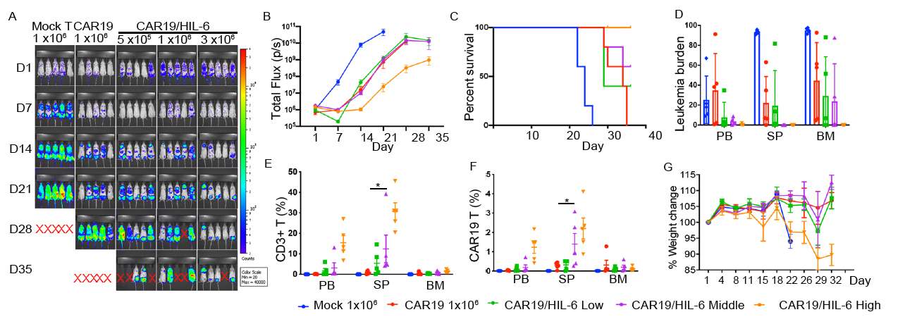 在本研究中,首先設(shè)計和構(gòu)建了一種持續(xù)表達且激活IL-6跨信號的CAR-T細胞。在體外和異種移植腫瘤模型中,HIL-6 CAR-T細胞的增殖和抗腫瘤效果得到明顯增強,轉(zhuǎn)錄組分析結(jié)果表明CAR-T細胞在HIL-6的刺激作用下,上調(diào)了與T細胞遷移、早期記憶分化以及IL-6/GP130/STAT3相關(guān)的信號基因。動物模型進一步發(fā)現(xiàn),HIL-6 CAR-T細胞會引起嚴重的移植物抗宿主?。?/span>GVHD)及CRS,從而限制HIL-6 CAR-T 細胞的臨床應(yīng)用。由于IL-6跨信號主要通過激活GP130信號通路,我們設(shè)計了一種能持續(xù)激活GP130的CAR-T細胞,結(jié)果顯示,在B細胞白血病和實體腫瘤的臨床前模型中,GP130 CAR-T細胞的增殖和抗腫瘤效果仍然明顯,且不會出現(xiàn)嚴重GVHD和CRS反應(yīng)。以上結(jié)果表明了IL-6跨信號能顯著提升CAR-T抗腫瘤作用,而GP130 CAR-T 的臨床應(yīng)用更安全。 同時提示在CAR T 細胞治療過程出現(xiàn)CRS時,不應(yīng)過早使用抗IL-6R的中和抗體。