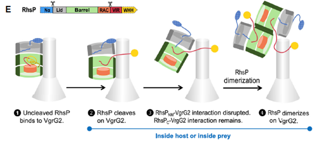 圖3 RhsP自水解引發(fā)的二聚體形成并靶向獵物細(xì)胞的步驟模型