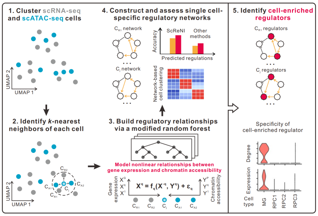 近日,中國科學(xué)院廣州生物醫(yī)藥與健康研究院王杰課題組與廣州國家實驗室李亦學(xué)課題組合作,成功開發(fā)了一種在單細(xì)胞水平構(gòu)建調(diào)控網(wǎng)絡(luò)的新工具ScReNI(Single-cell Regulatory Network Inference)。該工具通過整合單細(xì)胞轉(zhuǎn)錄組(scRNA-seq)與單細(xì)胞染色質(zhì)可及性(scATAC-seq)數(shù)據(jù),實現(xiàn)單細(xì)胞精度的基因調(diào)控網(wǎng)絡(luò)推斷。相關(guān)研究成果以題為“ScReNI: Single-cell Regulatory Network Inference Through Integrating scRNA-seq and scATAC-seq Data”的論文形式發(fā)表于國際學(xué)術(shù)期刊《Genomics, Proteomics & Bioinformatics》。