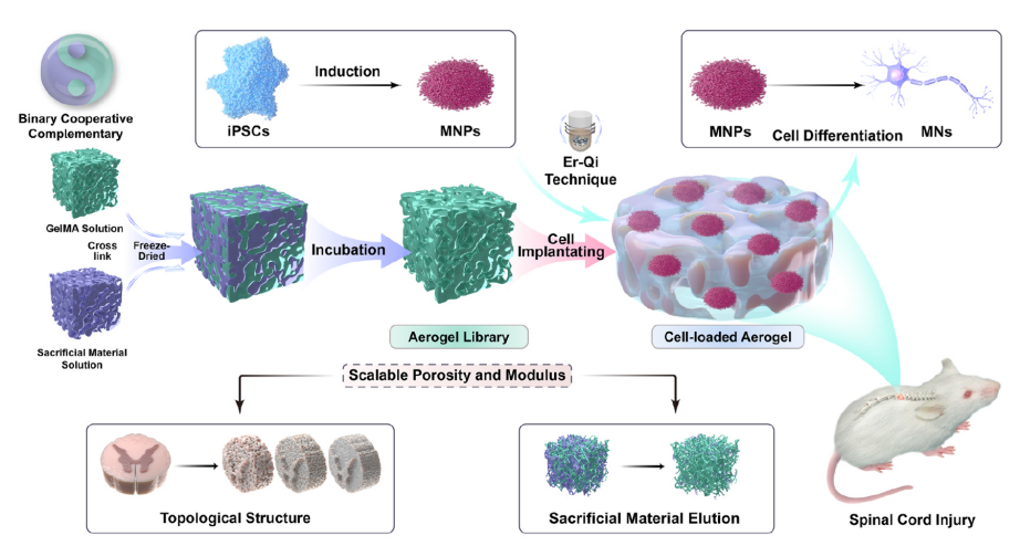 中國科學院廣州生物醫(yī)藥與健康研究院(以下簡稱“廣州健康院”)納米轉(zhuǎn)化醫(yī)學研究組和華中科技大學協(xié)和醫(yī)院孫家明教授團隊近期聯(lián)合在 Materials Today Bio發(fā)表了題為 “Aerogel library with varying porous structures and mechanics regulates motor neuron progenitor differentiation for spinal cord injury repair” 的研究論文。該研究構(gòu)建了一種微納結(jié)構(gòu)與力學性能可調(diào)控的多孔氣凝膠庫,揭示了仿生三維微環(huán)境的孔隙結(jié)構(gòu)與力學強度對人源誘導多能干細胞(hiPSCs)來源的運動神經(jīng)前體細胞(MNPs)譜系命運調(diào)控作用和關(guān)鍵分子機制,并驗證了其在脊髓損傷修復中的功能再生潛力。