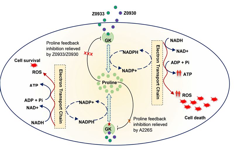 目前靶向篩選抗TB藥物研發(fā)的策略幾乎都是尋找Mtb關(guān)鍵代謝酶的抑制劑。近日,中國(guó)科學(xué)院廣州生物醫(yī)藥與健康研究院團(tuán)隊(duì)聯(lián)合廣州市胸科醫(yī)院(劉健雄等)、深圳市第三人民醫(yī)院(黃乃淇)及奧爾巴諾瓦大學(xué)中心KTH皇家理工學(xué)院(周洋)等單位合作發(fā)現(xiàn)谷氨酸激酶(glutamate kinase, GK)可能成為抗TB藥物的新靶標(biāo)。新的喹啉類化合物Z0930/Z0933(專利已授權(quán)ZL 201310385431.X)以前藥的形式起作用。其活性形式通過(guò)與脯氨酸競(jìng)爭(zhēng)結(jié)合GK增強(qiáng)而非抑制GK的活性,可以破壞脯氨酸合成通路的反饋抑制,進(jìn)而影響電子傳遞鏈,導(dǎo)致產(chǎn)生過(guò)多的活性氧(reactive oxygen species , ROS),從而殺死Mtb。突變的GK活性不受化合物Z0930/Z0933的影響,從而導(dǎo)致Mtb可以忍受較高濃度這類化合物。GK的突變點(diǎn)A226S可能位于Z0930/Z0933結(jié)合位點(diǎn)(圖1)。本研究首次報(bào)道了小分子增強(qiáng)而不是抑制代謝酶的活性可成為潛在抗結(jié)核藥物的新策略。相關(guān)研究成果以“Quinoline derivatives kill Mycobacterium tuberculosis by activating glutamate kinase”為題于2019年6月14日在線發(fā)表于Cell系列子刊Cell Chemical Biology。