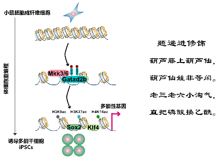 在經(jīng)典的激酶信號通路中,信號通過蛋白磷酸化傳遞;而在我們的最新研究中,發(fā)現(xiàn)信號可由蛋白磷酸化遞進(jìn)傳遞到蛋白的乙?;?。我們發(fā)現(xiàn)二級激酶家族7個蛋白中MAP2K3/6可通過磷酸化Gatad2b進(jìn)而調(diào)控組蛋白的乙?;?。這表明了不同的蛋白翻譯后修飾存在著“遞進(jìn)修飾”的信號轉(zhuǎn)導(dǎo)新模式,并在多能干細(xì)胞命運(yùn)調(diào)控中發(fā)揮著重要功能。這正像“葫蘆娃”七兄弟中的老三、老六,具有把磷酸化信號變?yōu)橐阴;盘柕摹斑f進(jìn)修飾”特殊本領(lǐng)。