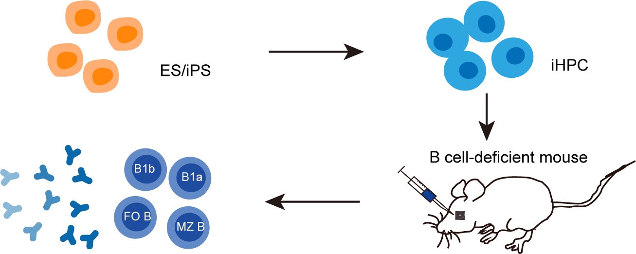 B細(xì)胞是體液免疫的關(guān)鍵細(xì)胞成分,包括固有免疫B1細(xì)胞和獲得性免疫B2細(xì)胞(MZ B, FO B)兩大類群。任何一種B細(xì)胞缺陷都會(huì)導(dǎo)致體液免疫受損,甚至導(dǎo)致嚴(yán)重感染類疾病。對(duì)于B細(xì)胞功能低下和不全相關(guān)疾病的治療,再生B細(xì)胞是一個(gè)理想的選擇。骨髓和脾臟等B細(xì)胞的發(fā)育場(chǎng)所有著極為復(fù)雜的微環(huán)境,多年來研究者們嘗試多種體外再生B細(xì)胞的方法,但都因?yàn)闊o法模擬上述復(fù)雜的B細(xì)胞發(fā)育微環(huán)境而停滯不前。王金勇課題組在多潛能干細(xì)胞(PSC)中共表達(dá)Runx1, Hoxa9, Lhx2三個(gè)轉(zhuǎn)錄因子,通過在造血發(fā)生(Hemogenesis)以及B淋系生成(lymphogenesis)階段連續(xù)作用產(chǎn)生造血種子,移植后巧妙利用B細(xì)胞先天缺失小鼠的體內(nèi)微環(huán)境,成功在小鼠體內(nèi)誘導(dǎo)出完整而成熟的B細(xì)胞譜系。