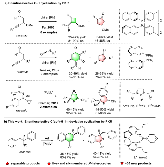 盡管已經(jīng)有一些成功的PKR的例子,但是產(chǎn)物結(jié)構(gòu)不同并可以通過柱層析分離的報道并不多見。2003年,F(xiàn)u報道了一種新的銠催化的C-H活化炔鏈上的醛,然后與炔進(jìn)環(huán)化,以良好產(chǎn)率和對映選擇性合成了底物范圍有限的環(huán)丁烷酮和環(huán)戊烯酮。Tanaka等人使用類似的底物和異氰酸酯發(fā)生分子間[4+2]環(huán)加成,得到了庚酰胺和環(huán)戊烯酮的對映選擇性衍生物。2017年,Cramer通過PKR反應(yīng)合成兩種獨(dú)特的氮雜環(huán)骨架,3-氮雜雙環(huán)[3.1.0]己烷和含季立體生成中心的1H-異吲哚。但是,在這些反應(yīng)中,底物的適用范圍比較窄。此外,含有季碳立體中心的雜環(huán)廣泛存在于天然產(chǎn)物、藥物和農(nóng)藥中,然而,對它們的對映選擇性合成是一項具有挑戰(zhàn)性的任務(wù)(圖2)。