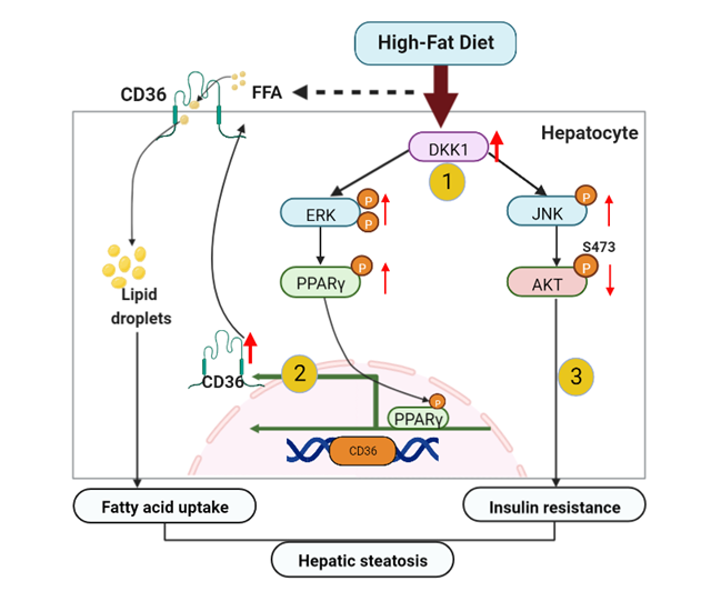 近日,中國科學院廣州生物醫(yī)藥與健康研究院李尹雄研究員課題組在Life Science Alliance上發(fā)表了題為Hepatic DKK1 driven steatosis is CD36-dependent的研究論文。這項研究闡明了高脂飲食誘導肝內DKK1升高進而促進肝脂肪變性的病理基礎。 DKK1通過ERK-PPARγ軸上調CD36增加脂肪酸攝取,通過上調JNK信號加劇肝胰島素拮抗,兩者的疊加是DKK1驅動脂肪肝的關鍵事件。