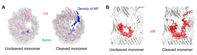 本研究首先在致病性腸炎弧菌中發(fā)現(xiàn)了一個(gè)能夠自水解的T6SS效應(yīng)蛋白R(shí)hsP,進(jìn)一步通過(guò)生化實(shí)驗(yàn)發(fā)現(xiàn)RhsP自水解為三個(gè)片段,N端、 Rhs桶和具有核酸酶毒性的C端(圖1A)。為了解答自水解這一過(guò)程對(duì)RhsP的分泌和核酸酶毒素釋放的作用,團(tuán)隊(duì)利用單顆粒冷凍電鏡技術(shù)獲得了RhsP自水解后(cleaved RhsP)和RhsP自水解前(Uncleaved RhsP)的高分辨結(jié)構(gòu)(圖1B)。對(duì)自水解前后的RhsP的高分辨結(jié)構(gòu)分析后發(fā)現(xiàn),Rhs區(qū)域形成了一個(gè)封閉的桶狀結(jié)構(gòu)。N端肽段從桶蓋頂部縫隙延伸出去,提示N端水解后的離開(kāi)軌跡(圖2A)。另外,發(fā)生水解后的VIR在構(gòu)象上發(fā)生了巨大變化,它以U形在桶內(nèi)伸展并將含有核酸酶毒素的VIR-C端送出到桶蓋上移引起的缺口處(圖2B)。最后,通過(guò)結(jié)構(gòu)分析發(fā)現(xiàn)VIR結(jié)合β-sheet的疏水內(nèi)表面,通過(guò)構(gòu)建VIR-C端F1208A/Y1209A突變株驗(yàn)證了RhsP自水解后引發(fā)VIR構(gòu)象變化促進(jìn)二聚體的形成。