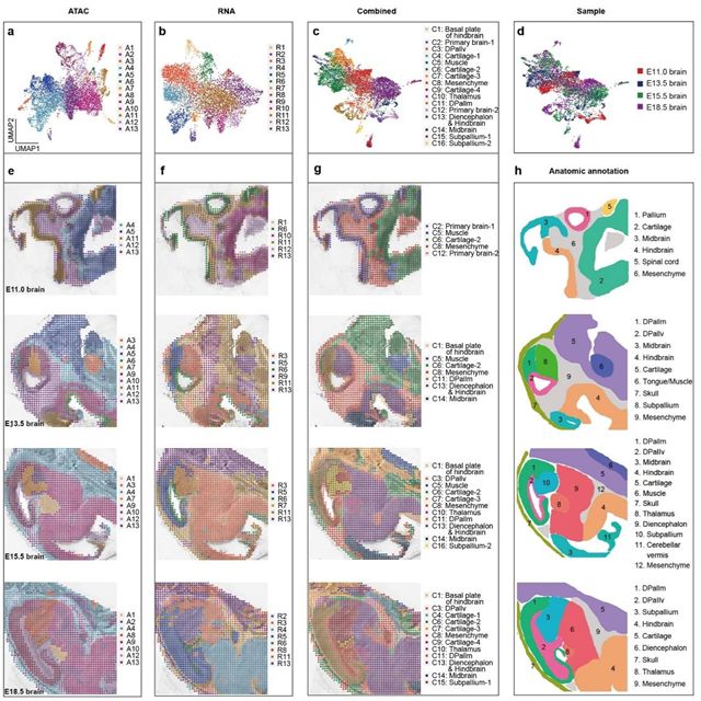 圖2. E11.0, E13.5, E15.5 和E18.5小鼠腦的空間基因表達(dá)、染色質(zhì)可及性以及結(jié)合二者的空間圖譜