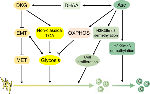 研究團隊分別采用Vc及其代謝產(chǎn)物DHAA和DKG等處理體細胞重編程,發(fā)現(xiàn)Vc表現(xiàn)出通過DKG依賴途徑和非依賴途徑促進重編程的雙重能力。一方面,Vc通過DKG非依賴的途徑促進細胞增殖,并誘導(dǎo)pre- iPSCs向iPSCs轉(zhuǎn)化,從而促進重編程。另一方面,Vc通過DKG依賴機制觸發(fā)間充質(zhì)-上皮轉(zhuǎn)化(MET)并激活糖酵解。值得注意的是,DKG激活了以增加琥珀酸、延胡索酸和蘋果酸為特征的非典型三羧酸循環(huán),促使細胞代謝從氧化磷酸化(OXPHOS)向糖酵解轉(zhuǎn)變。此外,由于其抗氧化能力,Vc抑制糖酵解,從而阻止糖酵解與上皮-間質(zhì)轉(zhuǎn)化(EMT)之間的正反饋,最終導(dǎo)致更高水平的MET。