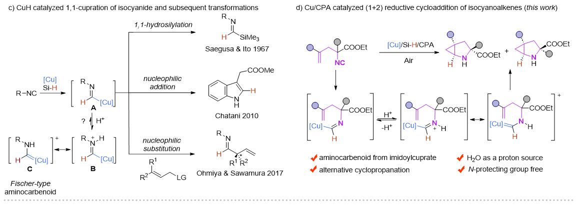近年來,Cu-H催化的烯烴的1,2-氫官能化反應(yīng)取得了飛速的發(fā)展,尤其是在對映選擇性氫胺基化領(lǐng)域,Buchwald課題組做了開創(chuàng)性且系統(tǒng)性的工作 (Acc. Chem. Res. 2020,53,1229?1243)。但與此形成鮮明對比的是,Cu-H催化的異腈的1,1-氫官能化反應(yīng)模式相對單一,這主要是由于形成的甲酰亞胺銅中間體是親核性的,只能發(fā)生親核取代和親核加成反應(yīng)。在此前的報(bào)道中,一些過渡金屬諸如Ni,Co,很容易與異腈配位形成亞胺金屬絡(luò)合物。在酸性條件下,這類物種更傾向于異構(gòu)形成一類新型的氨基金屬卡賓(Organometallics.,2003,22,2817?2819;Organometallics.,2021,40,968?978),但這類物種活性尚未被廣泛研究。