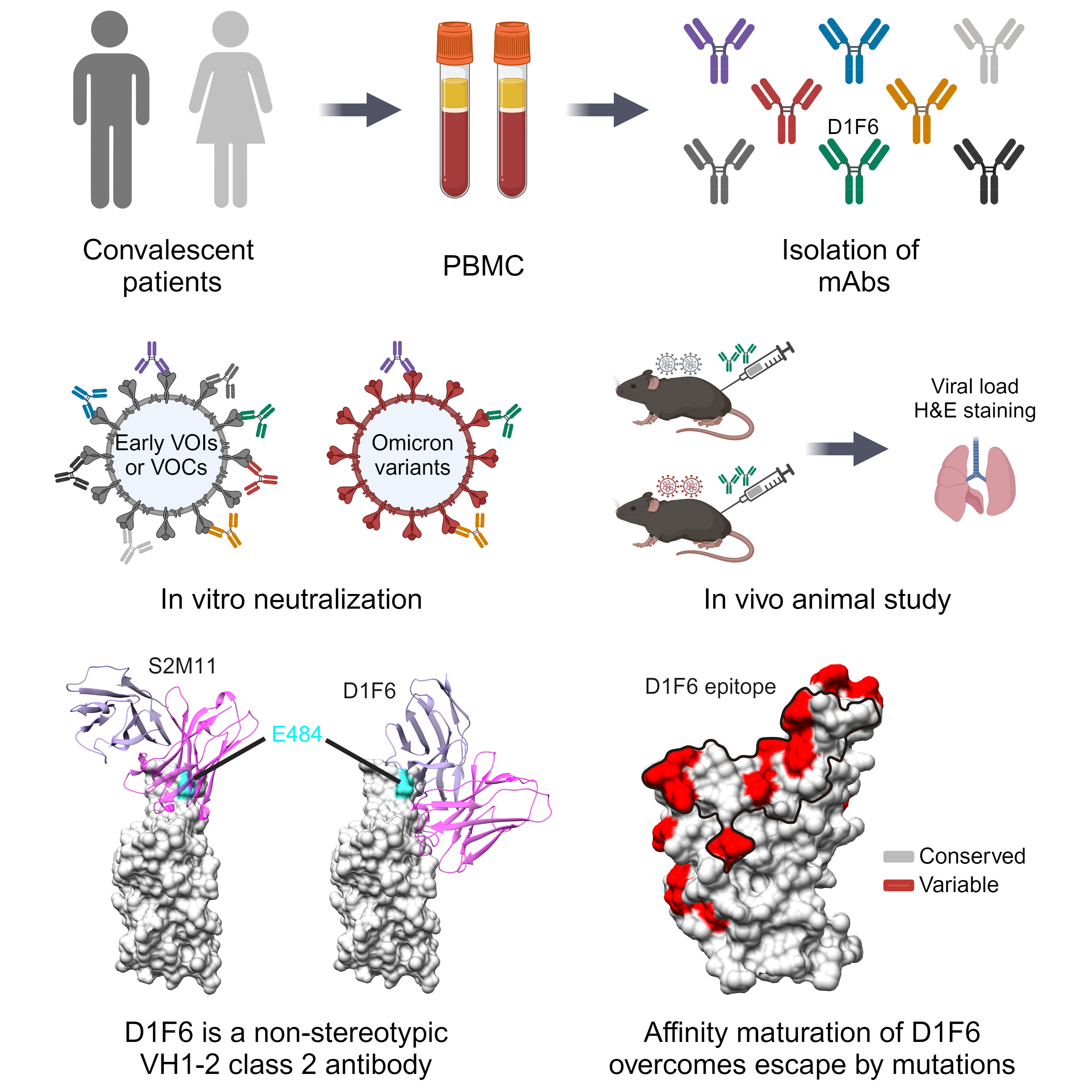 面對(duì)自然感染和疫苗接種產(chǎn)生的免疫壓力,新冠病毒持續(xù)進(jìn)化和變異,逃逸了絕大部分早期篩選獲得的中和抗體。其中,在人群中被廣泛誘導(dǎo)的VH1-2基因編碼抗體被認(rèn)為在新冠病毒早期的抗體免疫中起到了關(guān)鍵作用,但由于新冠病毒刺突蛋白E484K/A的突變,大多數(shù)VH1-2類抗體被逃逸。在該研究中,研究人員從早期新冠病毒野生株感染者中篩選到一株由VH1-2基因編碼的中和抗體D1F6。不同于其他已知的VH1-2抗體,D1F6不被攜帶E484A突變的Omicron變異株逃逸,對(duì)Omicron變異株的多種亞型仍保持高效中和活性。動(dòng)物實(shí)驗(yàn)結(jié)果表明D1F6可以有效抑制Delta和Omicron?BA.5、XBB.1.5、EG.5.1等變異株在小鼠體內(nèi)的復(fù)制。