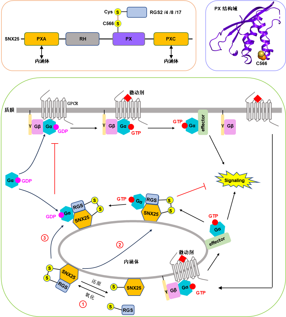 研究團(tuán)隊(duì)利用免疫沉淀-質(zhì)譜聯(lián)用技術(shù)和熒光共定位等實(shí)驗(yàn)方法,發(fā)現(xiàn)SNX25的PX結(jié)構(gòu)域能結(jié)合一些經(jīng)典的RGS蛋白,包括RGS2、RGS4、RGS8和RGS17。通過結(jié)構(gòu)生物學(xué)和細(xì)胞生物學(xué)實(shí)驗(yàn),研究團(tuán)隊(duì)發(fā)現(xiàn)SNX25與RGS蛋白的相互作用主要依賴SNX25-PX結(jié)構(gòu)域中C566與RGS蛋白N端半胱氨酸形成的分子間二硫鍵,且該相互作用受氧化還原的調(diào)控。通過熒光共定位實(shí)驗(yàn),團(tuán)隊(duì)進(jìn)一步發(fā)現(xiàn)PXA和PXC結(jié)構(gòu)域可以介導(dǎo)SNX25靶向內(nèi)涵體。通過招募經(jīng)典RGS蛋白到內(nèi)涵體,SNX25可以促進(jìn)內(nèi)涵體上Gαi/q蛋白的失活,最終抑制內(nèi)涵體上GPCR-Gi/q偶聯(lián)的信號(hào)轉(zhuǎn)導(dǎo)(圖1)。