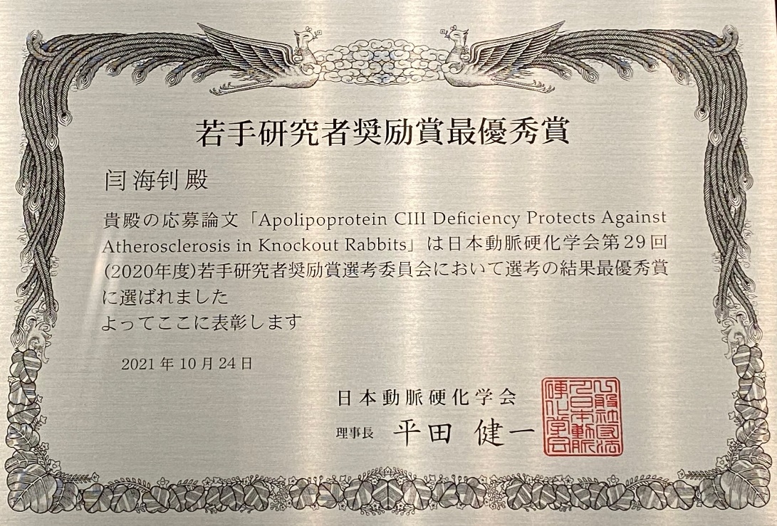 10月24日,第29屆日本動(dòng)脈硬化學(xué)會(huì)青年研究員獎(jiǎng)選舉報(bào)告會(huì)在日本京都國際會(huì)議中心舉行,經(jīng)過研究成果考核、會(huì)議現(xiàn)場(chǎng)答辯、評(píng)委及觀眾問答等環(huán)節(jié)的角逐,最終我院賴良學(xué)研究員課題組的閆海釗博士,與來自日本神戶大學(xué)和愛知學(xué)院大學(xué)的兩位候選人共同獲得了本屆青年研究員獎(jiǎng)。其中閆海釗博士以總分第一名的成績獲得了“青年研究員獎(jiǎng)·最優(yōu)秀獎(jiǎng)”,是自1998年之后再度獲此殊榮的中國學(xué)者。據(jù)悉,該獎(jiǎng)項(xiàng)創(chuàng)立于1992年,每年選拔1-3名40歲以下的科研人員予以獎(jiǎng)勵(lì),旨在表彰在動(dòng)脈硬化基礎(chǔ)及轉(zhuǎn)化醫(yī)學(xué)研究中取得優(yōu)秀成果的青年學(xué)者。
