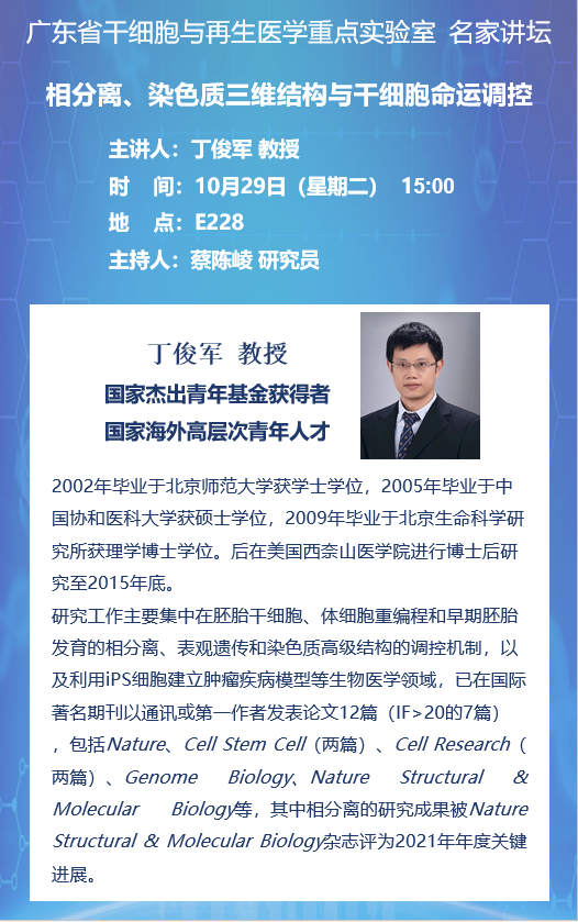 2024年10月29日廣東省干細胞與再生醫(yī)學重點實驗室名家講壇:相分離、染色質(zhì)三維結構與干細胞命運調(diào)控