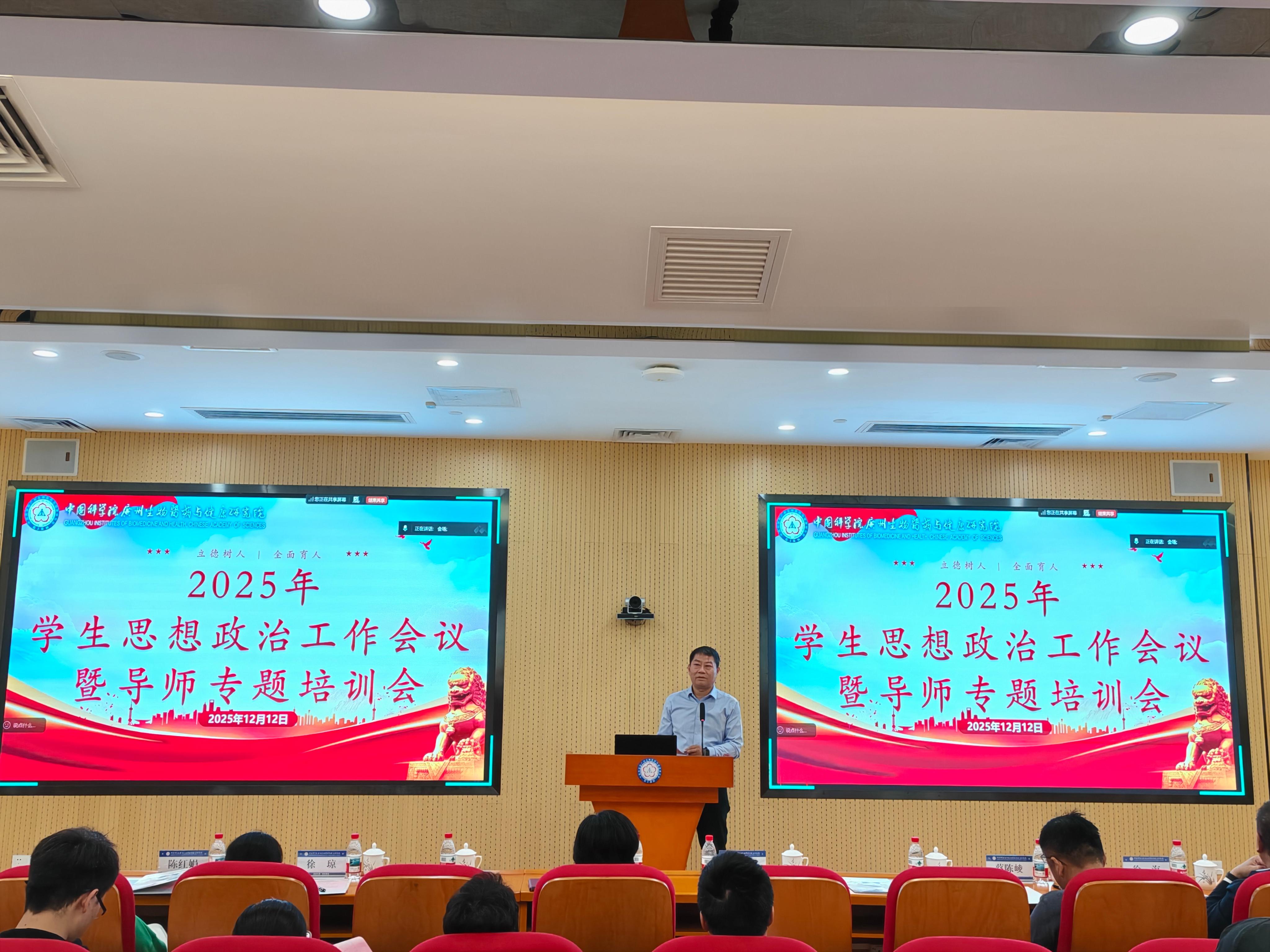 為深入學(xué)習(xí)貫徹習(xí)近平新時(shí)代中國特色社會(huì)主義思想和黨的二十大及歷次全會(huì)精神,落實(shí)《中國共產(chǎn)黨思想政治工作條例》及中國科學(xué)院關(guān)于加強(qiáng)學(xué)生思想政治工作相關(guān)部署,強(qiáng)化學(xué)生思政工作建設(shè),12月12日,廣州健康院召開2025年學(xué)生思想政治工作會(huì)議暨研究生導(dǎo)師培訓(xùn)會(huì)。會(huì)議聚焦新時(shí)代人才培養(yǎng)使命,系統(tǒng)總結(jié)年度思政工作,部署重點(diǎn)任務(wù),凝聚培養(yǎng)“有理想、敢擔(dān)當(dāng)、能吃苦、肯奮斗”的高水平科技人才共識(shí)。
